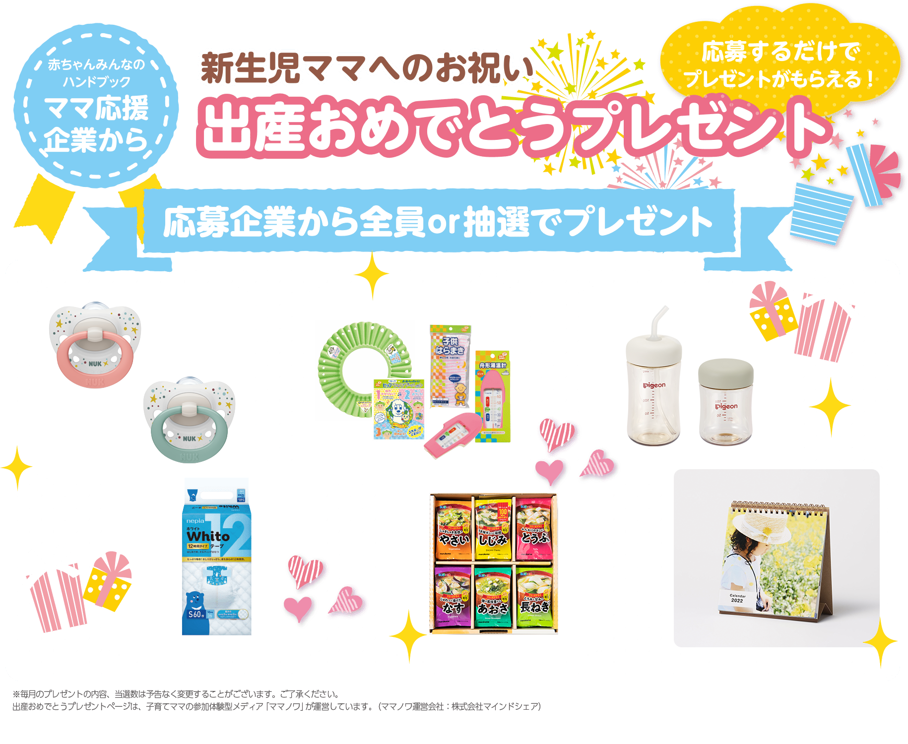 - 「赤ちゃんみんなのハンドブック」2020年4月発行に伴い、新生児ママへのお祝い 出産おめでとう プレゼントサイトを更新しました。